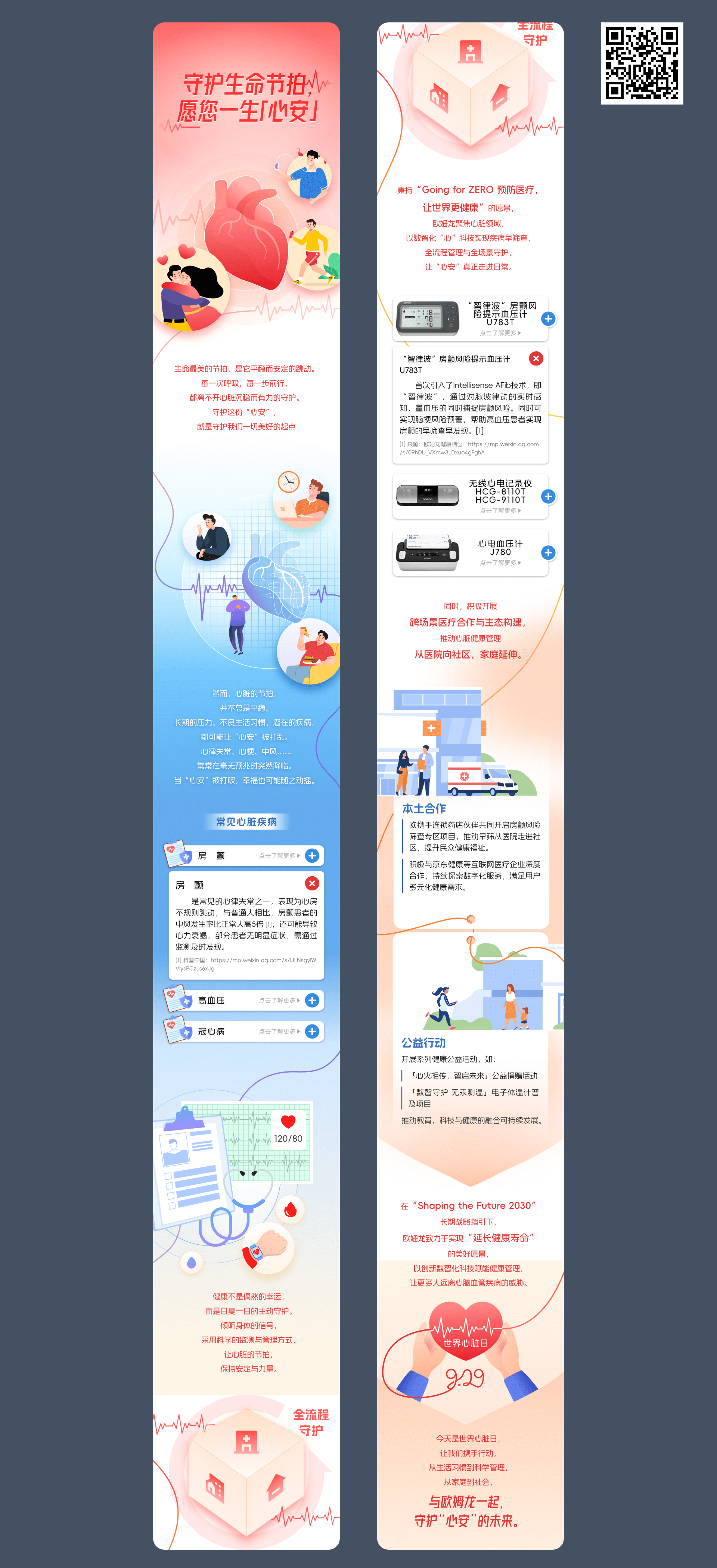 长图采用了典型的“瀑布流”布局,但通过背景色的切换(红->蓝->红)和插画风格的转换,将内容自然地分成了三个大板块:情感引入 -> 专业科普与产品 -> 生态合作与愿景。这种结构让读者在滑动过程中能清晰感知内容的转折。