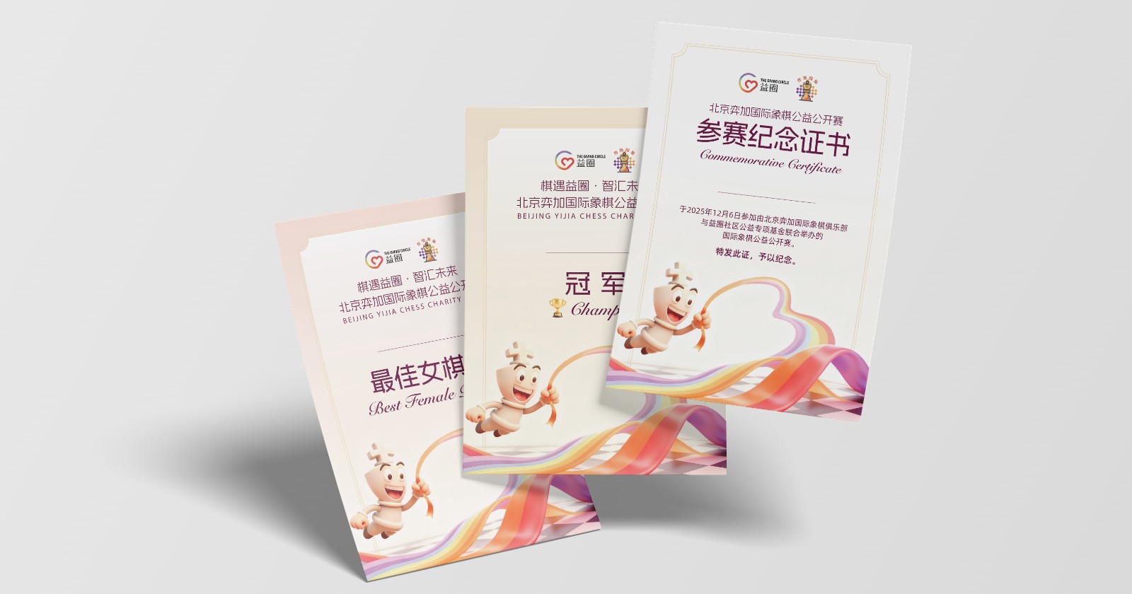 国际象棋小人是弈加国象俱乐部的经典IP——“瓦星人 · 小瓦”,动作是拉住糖果丝带,表现双方合作,共做公益。